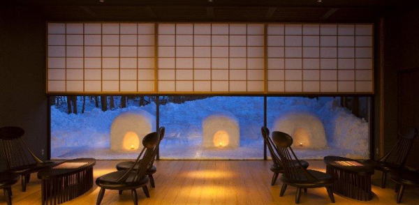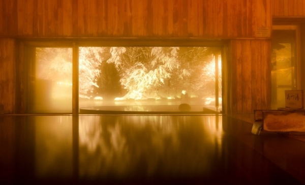 | 青森屋のお風呂(宿のHP写真)夜になると冬の風物詩の雪見露天「ねぶり流し灯篭」が見られる。 |