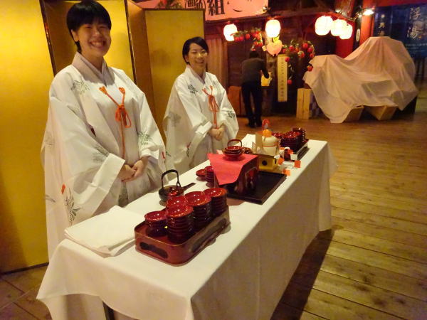 元旦の早朝 6:30 新年一番の朝風呂に入る。『じゃわめぐ広場』でお屠蘇のサービス。 |