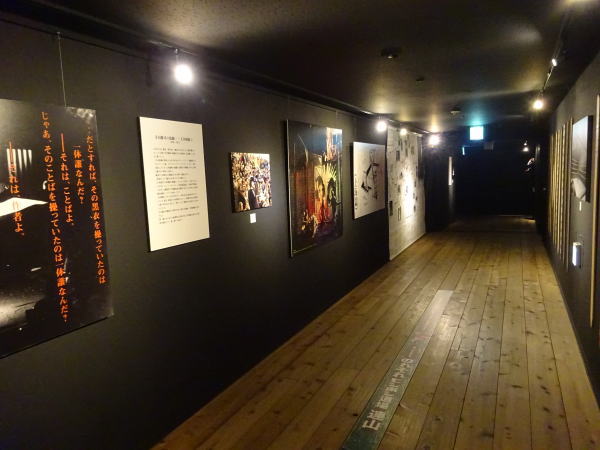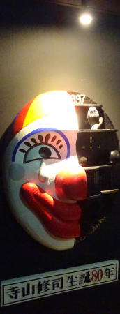 本館と東館をつなぐ渡り廊下の闇に忽然と出現した「寺山修司の迷宮かくれんぼ」。出入口には修司記念館のトレードマーク、ピエロのお面が微笑みかけ、三丁目あたりの小路を寺山が愛した馬たちが駆け抜けて行く。 |
