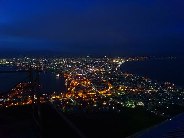 函館山登山バスは函館駅から来るバスなので満員の乗客。立ったまま約20分程で山頂に到着。 見晴らし台進むとどの展望台も5重6重の観光客で埋まっていてまともに夜景が見れない。隙間を探して前に出て何枚か写真に収める。一瞬だが評判通りに美しい夜景だった。照明も高層建築もなく静かに控えめな夜景で香港などよりずっと日本的で素晴らしい。 |