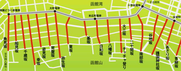 | 函館は函館山に向かって幾つもの坂が貫いている。 明治時代から幾度となく街を襲った大火により多くの命と家を失った経験から、道路は入り組まず真直ぐ道幅も広くして延焼を阻止しようという防衛策から多くの坂道生まれたそうだ。 |