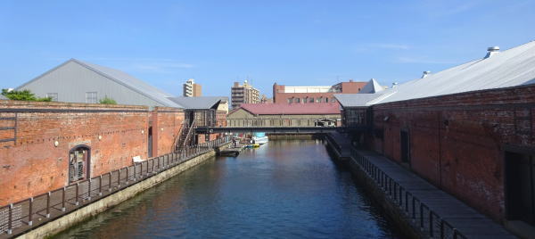 赤レンガ倉庫から運河を渡る。 すぐ先にホテル『ラビスタ函館ベイ』が見える。 |