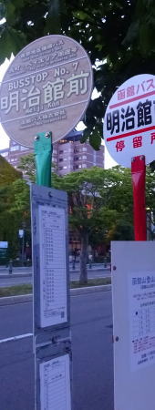 部屋で一休みしてから午後7時過ぎ、一日乗車券を使いバスで 函館山の夜景見学に向かう。 ホテル最寄の明治館バス停で待つ。 |