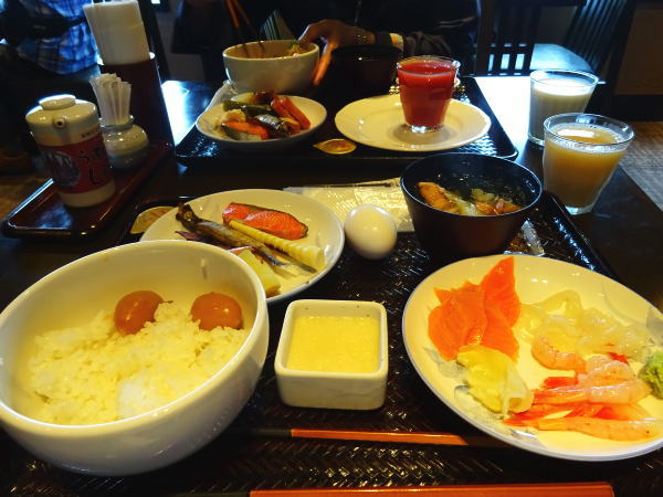 6月30日朝6:30 2階レストランへ。一番のりと思いきや、レストラン入口はすでにすごい行列。日本一の朝食と宿が自慢するだけあって、それ目当ての宿泊客が多いようだ。しばらく待ってやっと入場。新鮮な食材が山ほどで朝からたいへんだ。 |