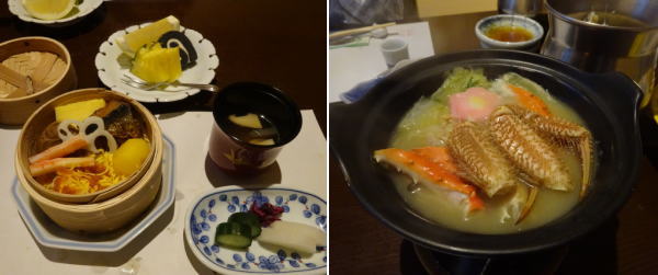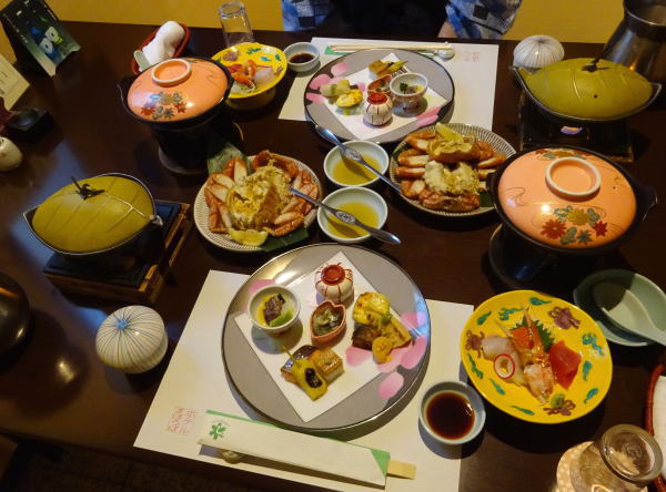 お風呂から出て一休み。夕食は個室食事処『遊宴』で。会席料理は毛蟹も一人一杯ついて豪華。 味付け、盛り付け、素材も新鮮で とてもよく出来ている。満点の内容。 |