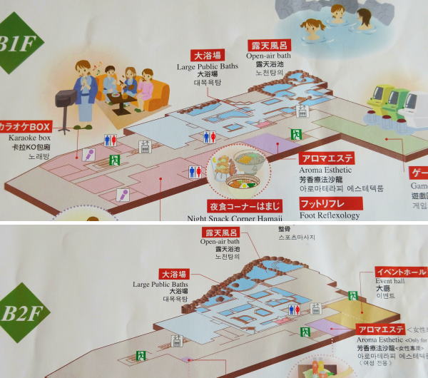 荷物を整理してお風呂へ。地下一階が男湯 地下二階が女湯、朝は入れ替えられる。 |