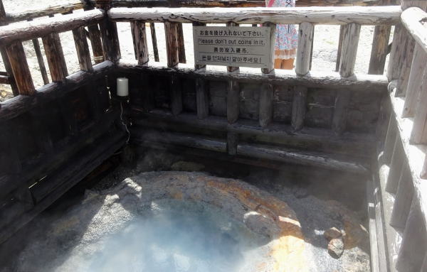 地獄谷からさらに山道を登り日和山・大湯沼へ。 日和山が噴火したときの火口跡で沼底は、約130℃の硫黄泉が激しく噴出してる。 |