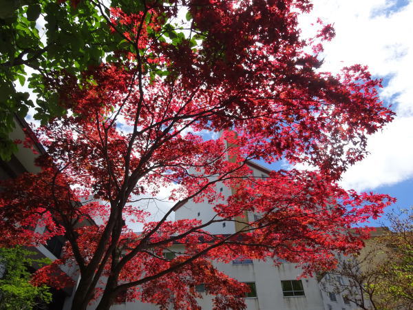温泉街に初めて見る夏の紅葉。 |