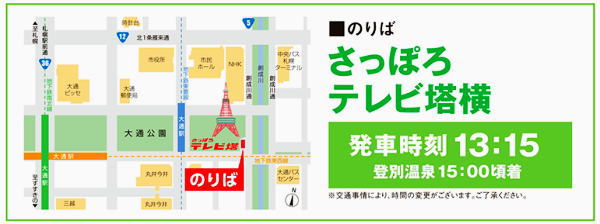 旭川駅11:41スーパー宗谷2号〜12:06札幌駅着。登別温泉の宿『まほろば』の送迎バスはさっぽろテレビ塔から13:15発。 |