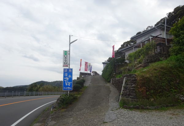 このあたりの国道沿いに高知名産の柑橘類の無人店舗がならんでいる。文旦や山北みかん、200円入れてひと袋買って宿に持っていく。久百々民宿いさり火に到着。 |