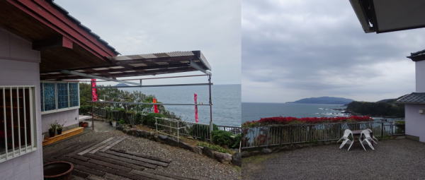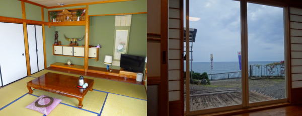 いさり火は典型的なお遍路宿。一階の和室に通される。お風呂は貸切で太平洋を眼下に見ながらの贅沢ないいお風呂。遍路宿らしく洗濯やアメニティも至れり尽くせり揃えてありがたい。 |
