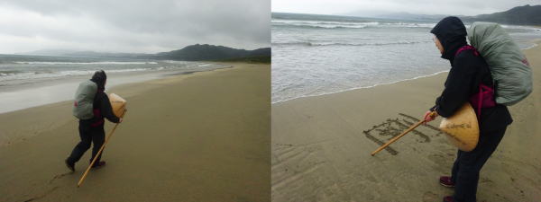 大岐の浜で『南無大師遍照金剛』を砂に描く。最後の一字書く前にが途中で波にさらわれ、後からM(剛)だけ書き込む。 |