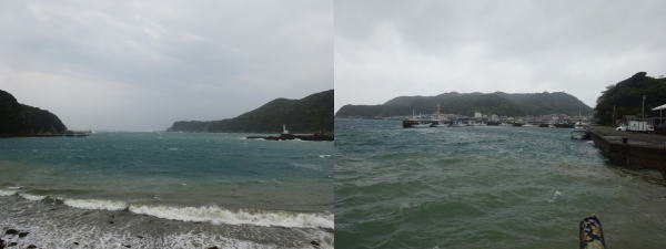 土佐清水市浦尻の港は強風で荒れ狂っている。が幸い雨は降られなかった。 |