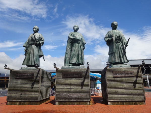 | JR高知駅前広場で迎えてくれるのは『武市半平太』『坂本龍馬』『中岡慎太郎』の像 |