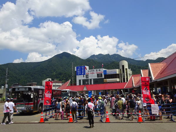 越後湯沢駅前バス停はすごい人の行列。それは 苗場スキー場で開催のフジロックフェスティバルに向かう人だった。会場に向かう何台もの大型バスが、吸い込むように客を乗せて出発している。 |