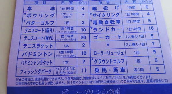 宿には2泊すると、ステイチケット(館内施設利用券)30ポイントx4枚がついてる。 |