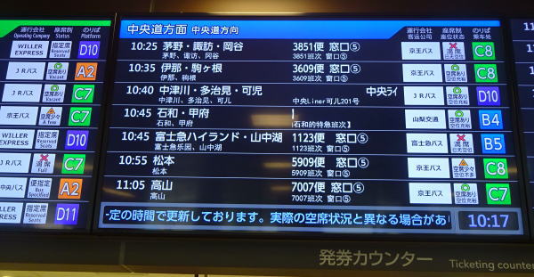 新宿バスターミナルの4階が出発ロビー 10:45発〜甲府駅着12:44分 僅か2時間で到着。 |