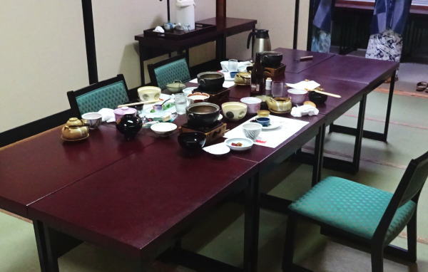 梅ぞ乃の夕食は部屋食だが、足の悪い姉の為にテーブル席に用意してくれた。 |