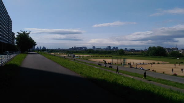 | 多摩川堤を歩く。上流には昔、東横線の多摩川園前から長嶋さん王さんなども練習した巨人軍多摩川グラウンド が見えたのだが、今は多摩川園も巨人軍多摩川グラウンドもなくなって淋しい。 |