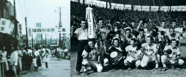 | 1960(昭和35)年夏、1961(昭和36年)春.硬式野球部甲子園連続優勝、この光景に憧れ受験したのだ。 |