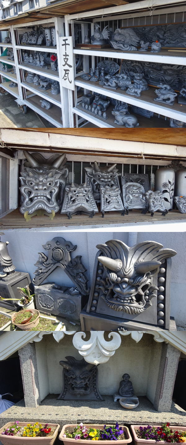 今治市に入り、菊間は菊間瓦の街。街道沿いには瓦工場が多数並んでいる。 |