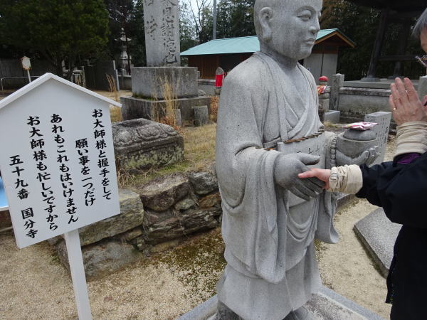 | 境内に「握手修行大師」がお遍路さんを迎えている。微笑ましいお大師さんには全員が握手して帰る。国分寺の御本尊「薬師如来」は人々を病苦から救う医薬の仏とされていて、握手大師さんの横に「薬師の壺」があり触れることができる。 |