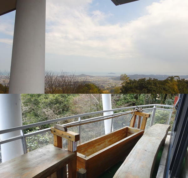 今治の市街地が眼下に望め、その先には瀬戸内海に浮かぶ島々、さらに「しまなみ海道」も一望できる眺望豊かなお寺である。展望台の足湯に何故かお湯が入っていない。 |