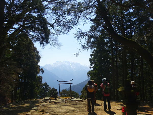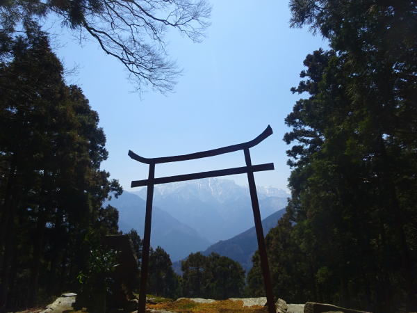 | 石鎚山 西の遥拝所 星ヶ森「かねの鳥居」越しに石槌山。帰りは1時間半で下り終え宿の戻る。荷物を受け取り伊予鉄道・今治へ。 |