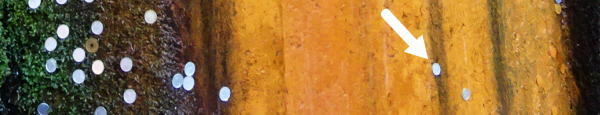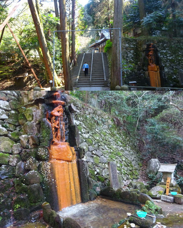 Mが投げた一円玉は見事に「御滝不動尊」岩肌に吸い付く! |
