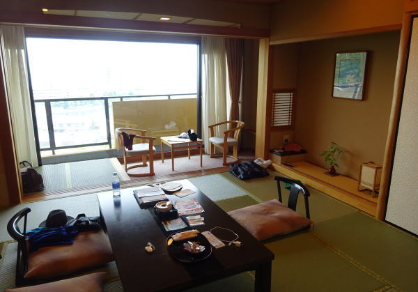 部屋は501号室、琵琶湖の眺めがいい。道中AKさんに話していた、西国30番札所のある竹生島は湖右端なのでで部屋からは見えなく少し残念だった。 |