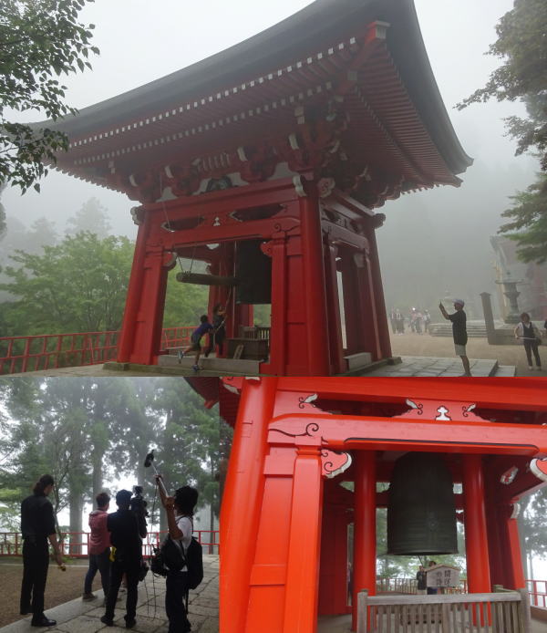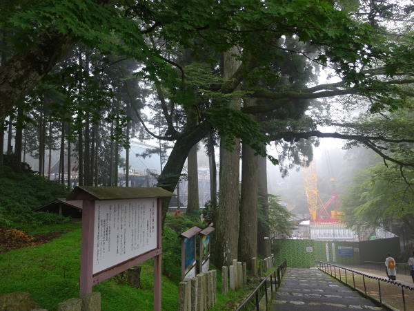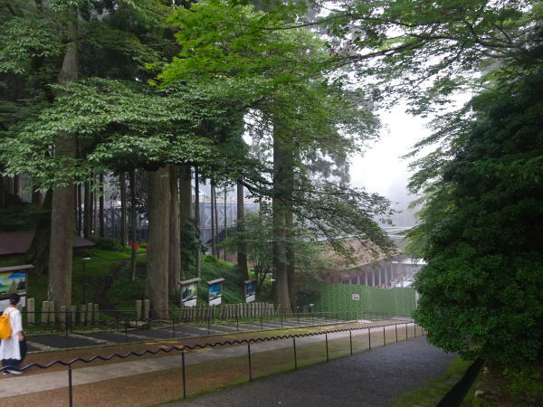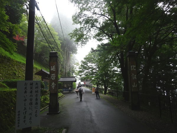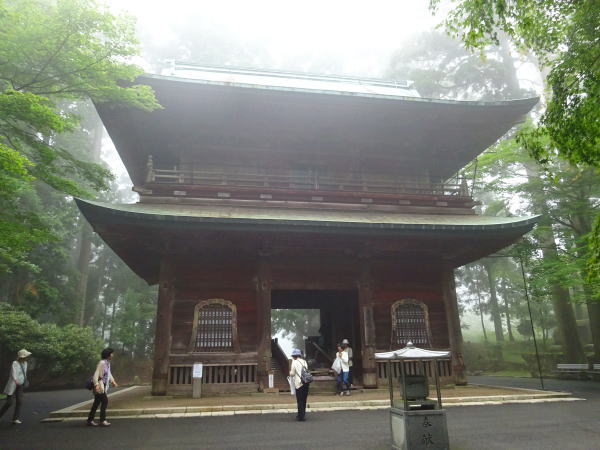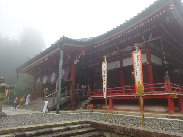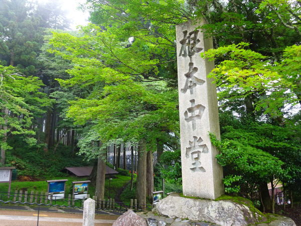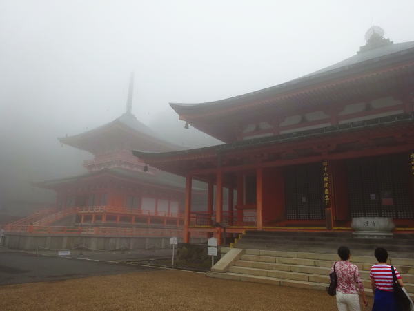 石段から振り返ると根本中堂正面が霧に霞んでいる。 |