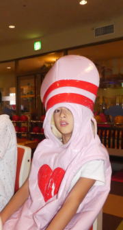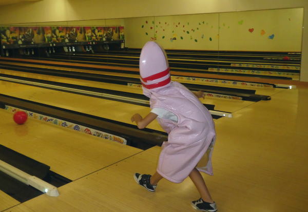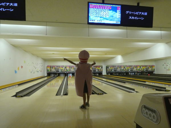ボーリングピンの着ぐるみを借りてプレー。勿論ガターのないガターレスにしてもらう。スコアは100点超えを争うレベルだが楽しめた。 |