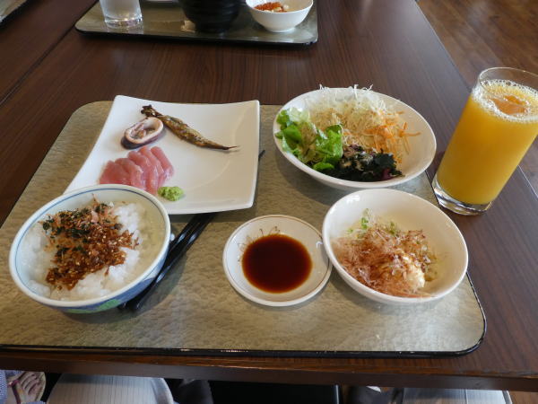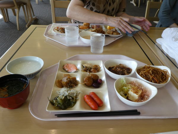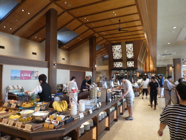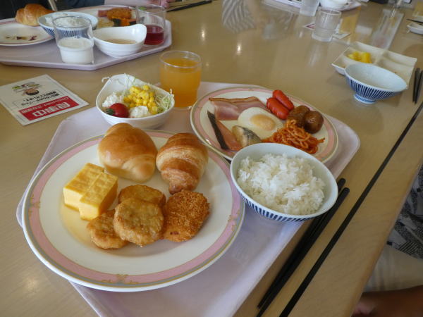 翌日、8月23日、2日目の朝食は夜と同じ一階レストランでバイキング。夏季合宿の団体さんが宿泊していて一般宿泊者は少数だったが、バイキングは北海道産の食材が豊富にならび充分美味しくいただく。 |