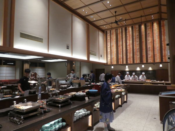 朝食も夜と同じ一階レストランで。朝も豪華な食材で食欲をそそられるが、昨夜食べ過ぎているのでセーブするのに苦労する。定番のいくら&サーモン&いか丼が人気だった。 |