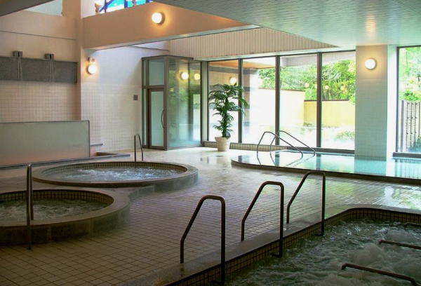 お風呂はホテル1F温泉保養館ほっとぴあに源泉かけ流しの露天風呂のほか大浴槽・ジャグジー風呂・気泡湯・寝湯・打たせ湯などあり、ナトリウムー炭酸水素塩泉、やや暑め、連泊の方が数名入浴中。 |