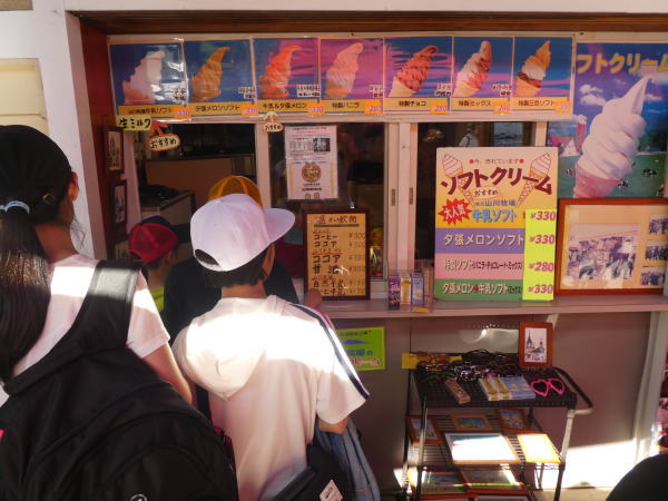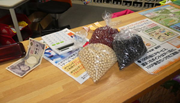 売店でお土産に、あずき、黒豆、大豆 3袋で1000円。Mが安いのに感激していた。 |
