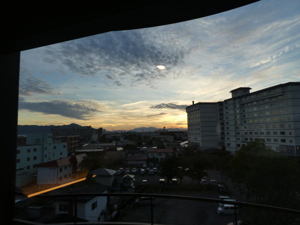 ホテル万惣の部屋から左前の函館港の向こうに函館山が遠く見える。 |