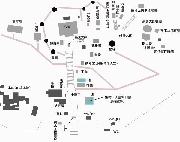 入山料300円で場内に入り緩やかな坂の参道をすすむと弘法大師礼拝石の大岩の前に金堂(本堂)がある。 |