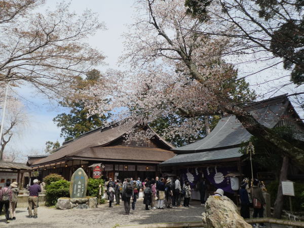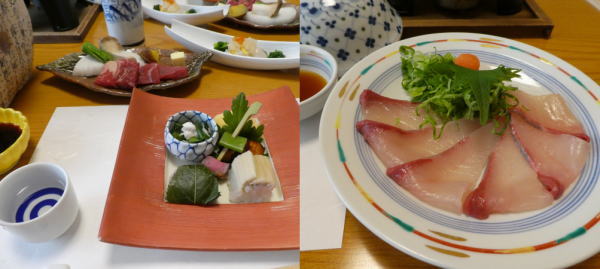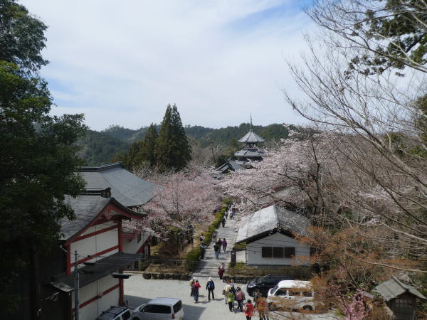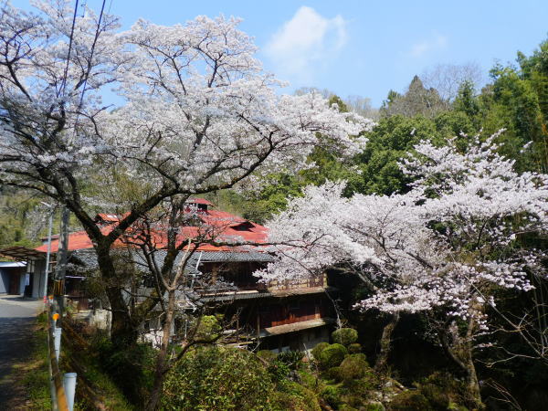宿に帰ってゆっくり温泉につかる。明後日高野山への参道は24`の難所を登るので今日明日はその準備を兼ねて近くを歩き回っている。17:30〜今夜も部屋食。昨日今日快晴で明日もいい天気らしい。夕食は昨夜と同じ地酒2合お願いした。宿の窓外の桜は満開できれい。 |