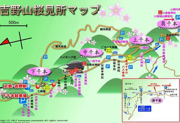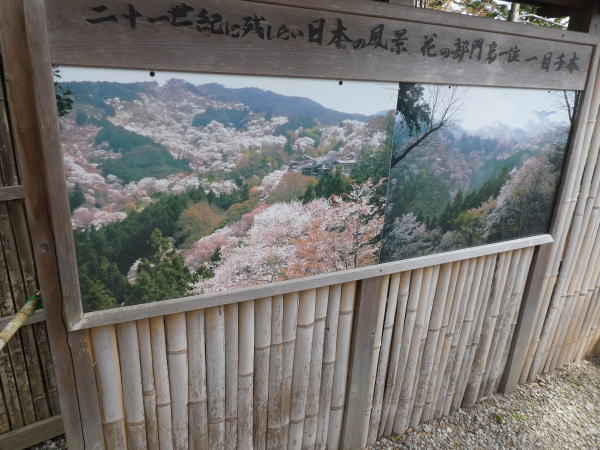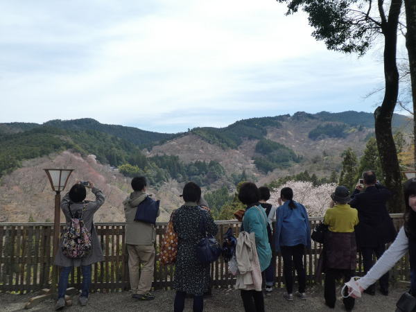 吉野山のシロヤマザクラは下・中・上・奥の4箇所に密集して”一目に千本見える豪華さ”という意味で「一目千本」とも言われている。下から、下千本、中千本、上千本、奥千本と呼ばれ、4月初旬から末にかけて、下から山上へ順に開花してゆく。 |