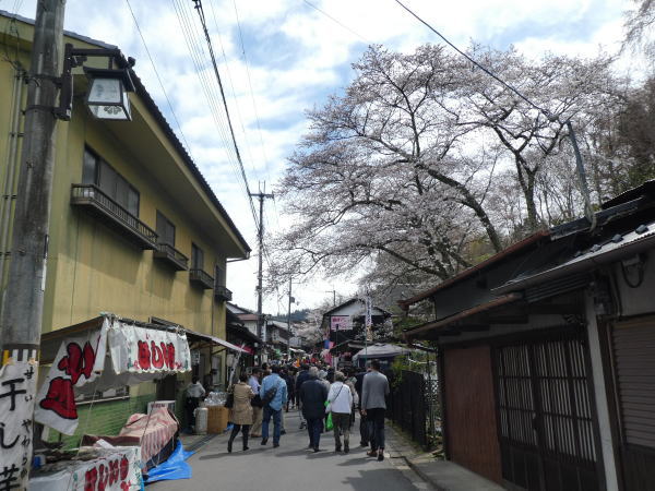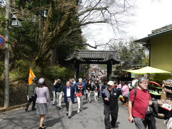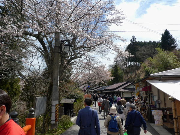 事前にチェックしていた観光協会の情報では下千本は今日満開の予測だったがほとんどは蕾が少し開いてきた程度で期待したほどの桜が見れなかったが、駅を出たところからはすごい観光客で坂道の歩道はいっぱい。 |
