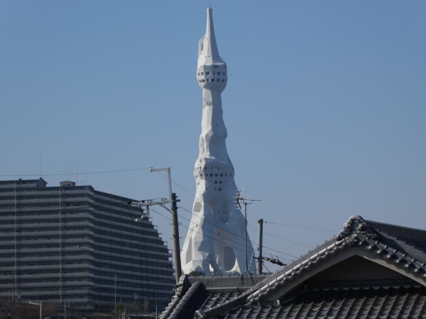 川西駅のホームから右前方に異様な建造物。これはPL教団の「大平和記念塔」という。かの清原、桑田など甲子園を沸かしたPL学園を運営するパーフェクト