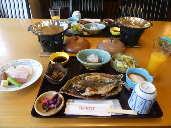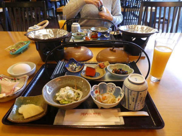 16時チェックインしてすぐに宿自慢の天然温泉のお風呂へ。5:30〜夕食は部屋食。窓から近鉄線河内長野駅の向こうに夕日が沈んでいく風景を見ながらの夕食。 |