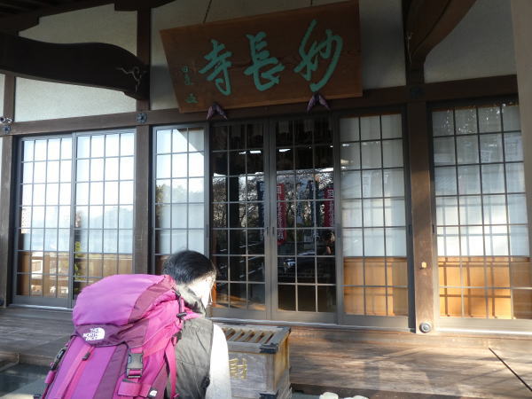 住宅街から黄金橋という趣のある鉄の橋を通って急な坂道を登り切ったところに宿・河内長野荘があった。チェックインは16時からなので宿の隣に沢山のぼりの立つお寺がありお参りしていく。 |