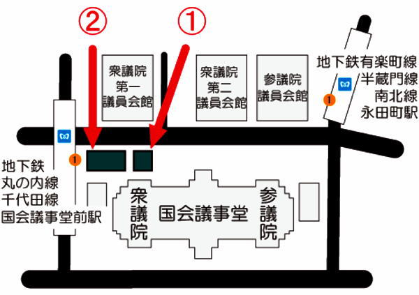 平日/衆議院参観通用門 [①] 土/日/休日 衆議院面会受付所 [②] |