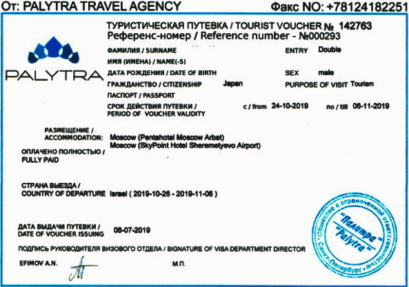 ロシア領事部で申請受理されればビザ取得にかかる費用はこの「Travel Russia」の空バウチャー料金999ルーブルx2=約3400円のみである。 |