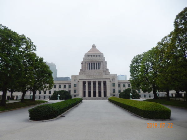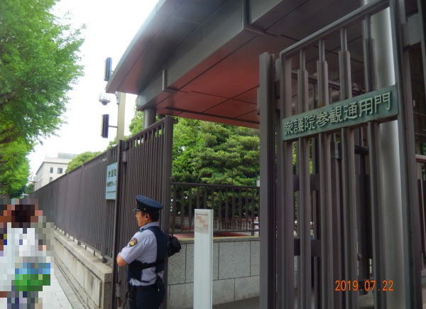 国会議事堂の裏側の参観通用門に着く。 昨日参議院選挙が終わったばかりなので国会議事堂はどうなっているのだろうか? |