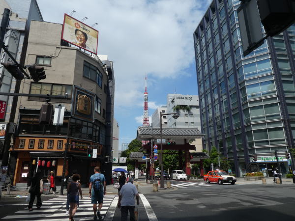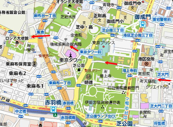 ロシア大使館へ申請時間に間に合うように9時前に浜松町駅に到着 歩き始める。地図で調べるとJR浜松町から大門を通って、芝・増上寺の脇を抜け東京タワー下を通って行くとすぐだ。 |
