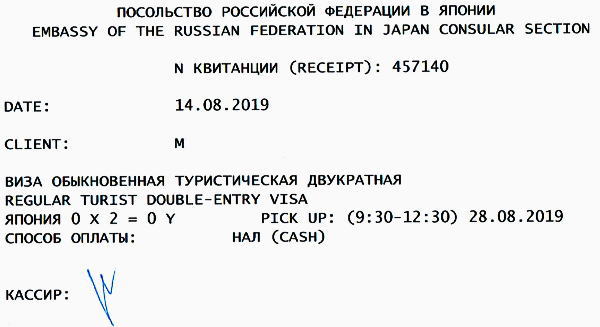 8月28日発行されるビザの貼られたパスポートの引換証をもらって無事申請終了する。 やったぞ~~~ 無料でできた満足感いっぱいの気持ちでロシア大使館.領事部事務所を後にする。 かかった費用は999ルーブルx2=約3400円だけ! あとは指定の28日に入国許可証(Viza)の貼られたパスポートを受け取りに来るだけだ。 |