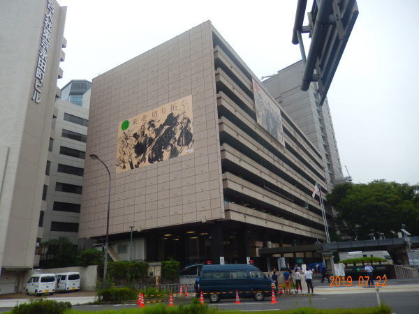 途中自民党本部前を通る。この日は中で安倍総理大臣の参議院選挙後のインタビューが行われていて、本部周りは報道各社の取材用車両がたくさん停車していた。 |